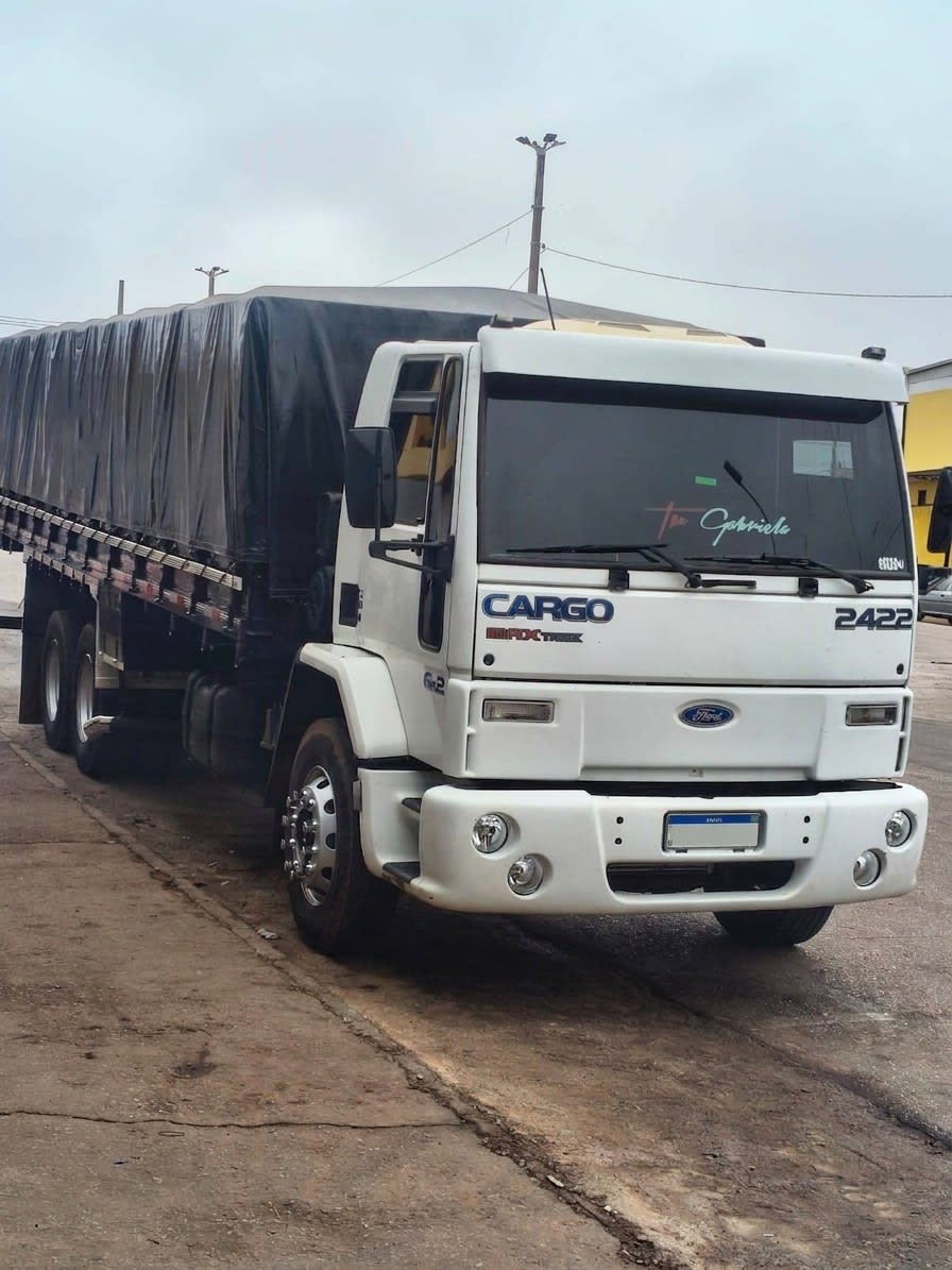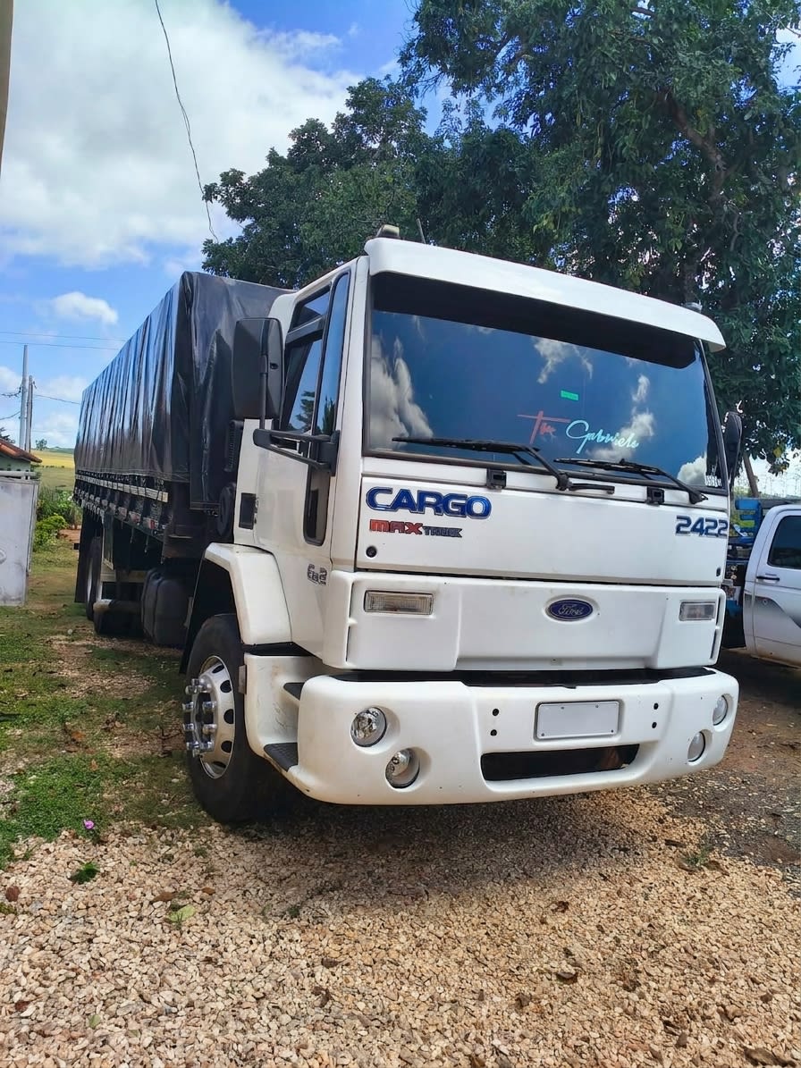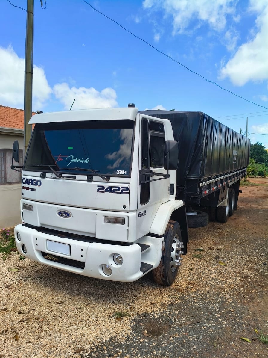 Ford Cargo 2422 4x2 ano 2005, com motor Cummins e conjunto com carreta 2 eixos. Implementação com 7,50 m de comprimento e 1,90 m de altura de tampa, 8 pneus zero, 2 pneus novos na dianteira e recapados na tração. Conjunto pronto para trabalhar com excelente custo-benefício.